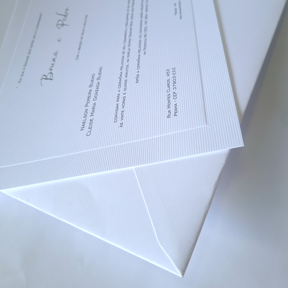 Primeiramente, a base deste convite é o exclusivo Papel Microcotelê 240g. Sua textura, por sua vez, é composta por finíssimas linhas horizontais em relevo, que remetem a um tecido nobre e proporcionam uma sensação única ao toque. Como resultado, o convite já comunica um alto padrão de qualidade antes mesmo da leitura da primeira palavra.